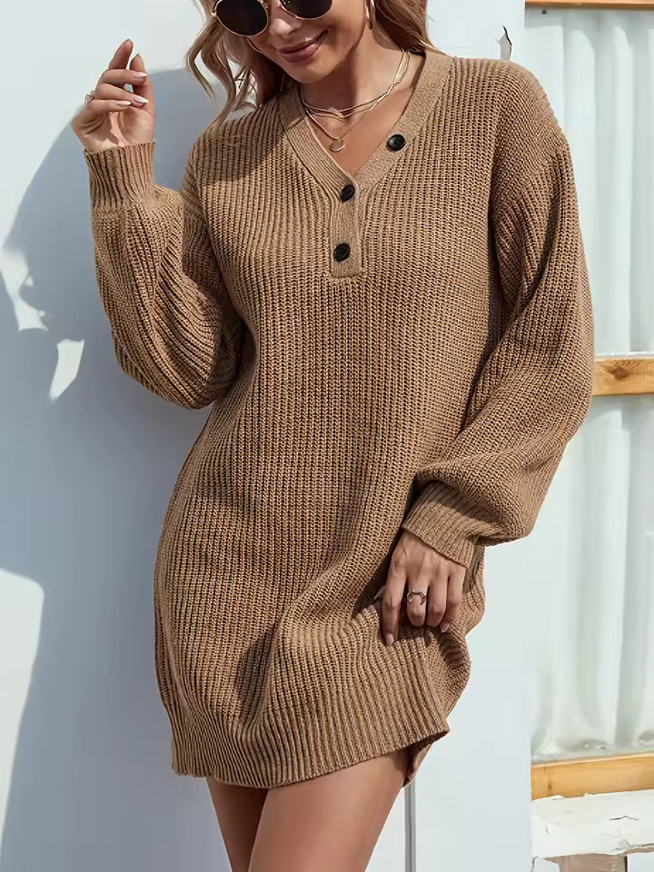 Le col en V flatte la silhouette et apporte une touche de légèreté, équilibrant parfaitement le style cosy de la robe.